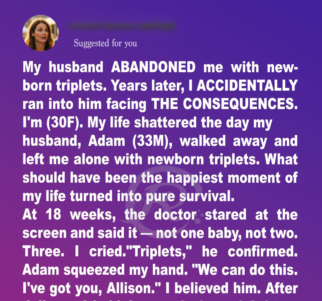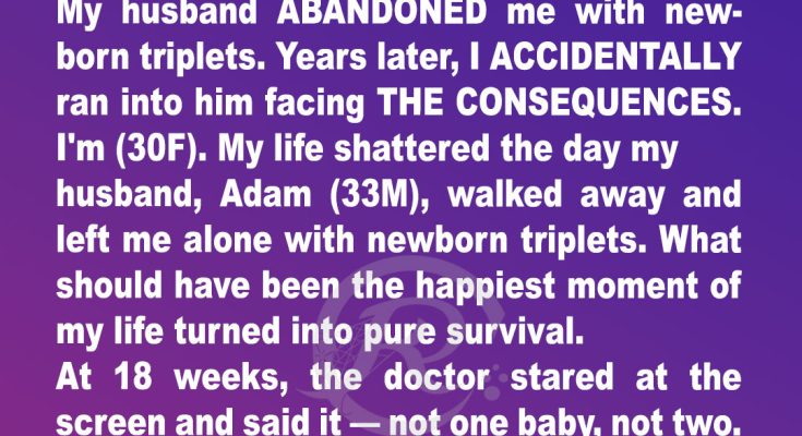 I was 23 when Adam walked out of our lives, and even now, at 35, I can still hear the silence he left behind. There was no final conversation. No apology. Just the sound of the hospital door closing behind him while I took turns holding our newborn triplets in my arms. I was stunned, stitched, and entirely alone.