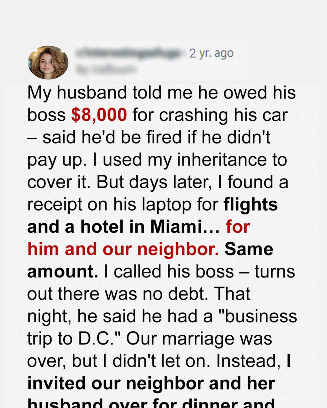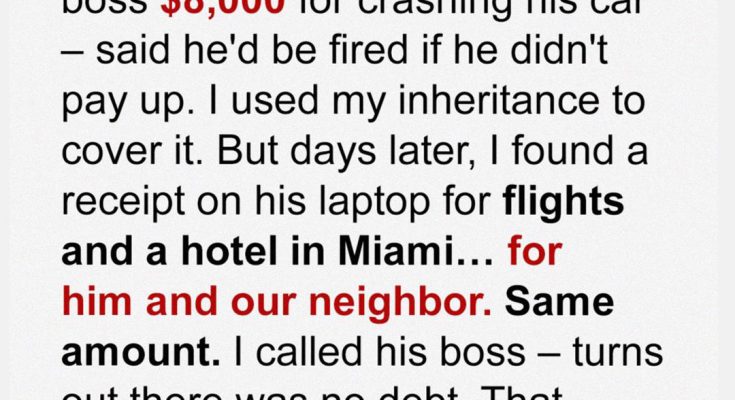 When Mike claimed he owed his boss $8K for a wrecked car, his wife used her inheritance to bail him out — only to discover it was all a lie. What she uncovered next turned her quiet trust into silent revenge.