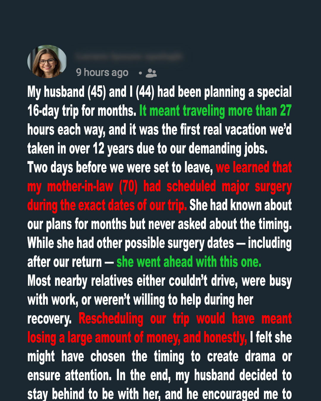 “So the surgery,” I asked slowly, “the whole emergency right before the trip… that was all a lie?”