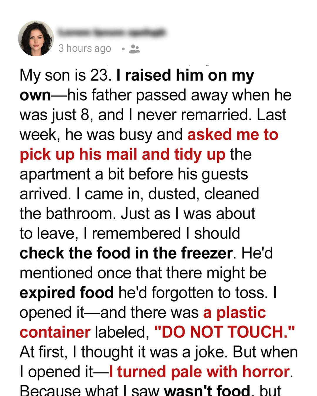 I Found a Plastic Container Labeled ‘DO NOT TOUCH’ in My Son’s Freezer – And I Really Wish I Hadn’t Opened It