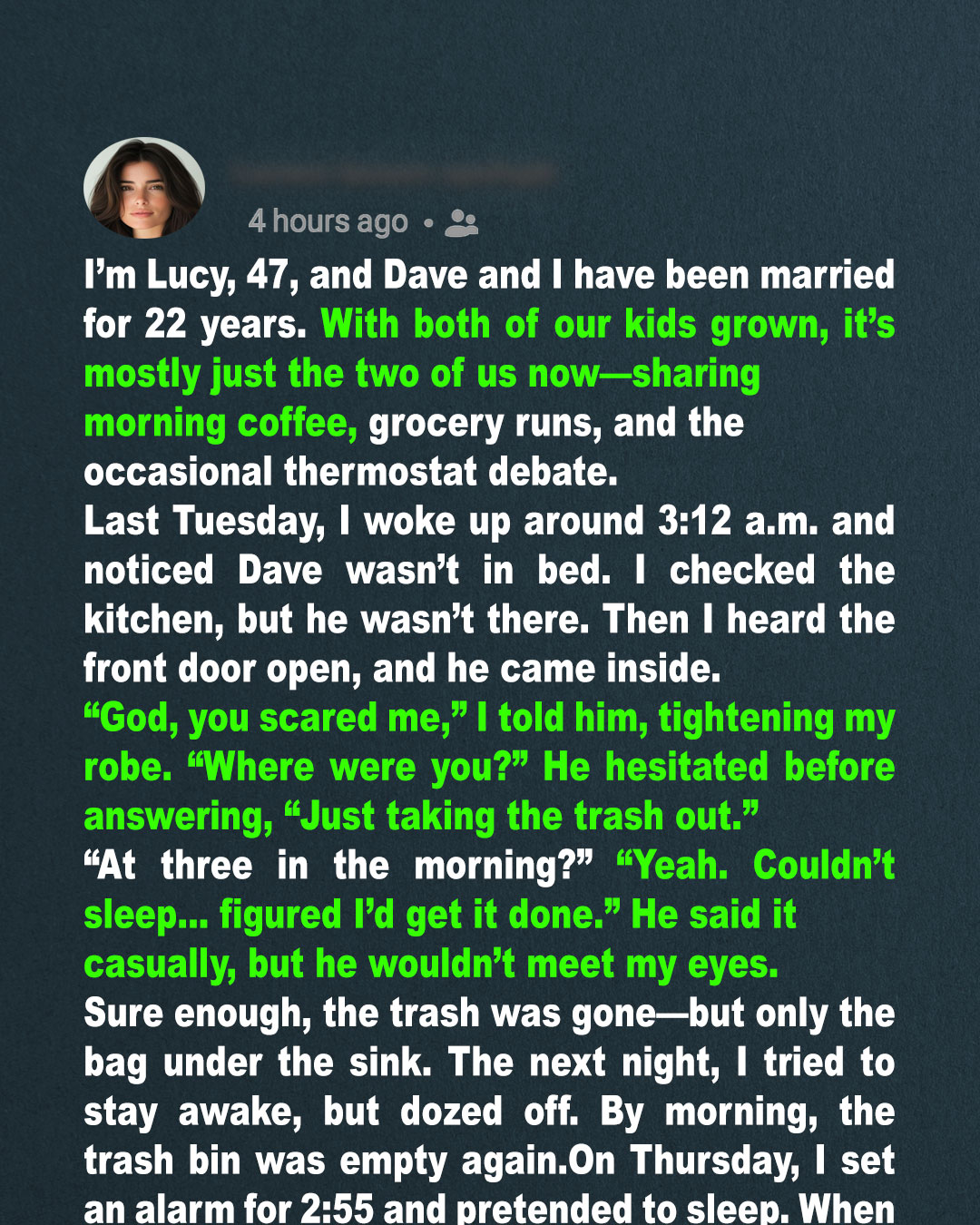 After 22 years of marriage, my husband suddenly started taking the trash out at 3 a.m. He’d never volunteered for it… not once. So why now? One night, I followed him and what I discovered broke my heart in ways I wasn’t ready for.