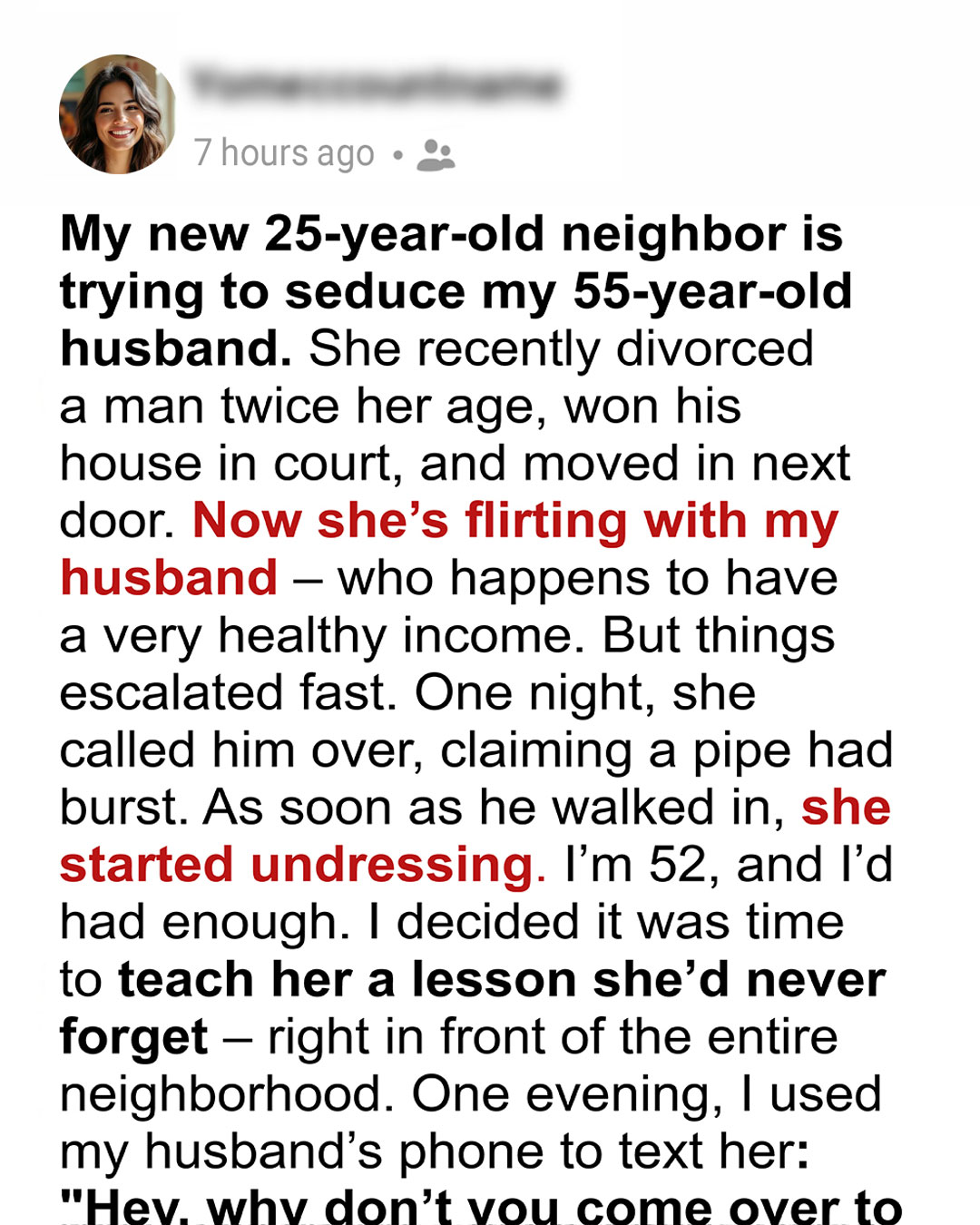 At 52, I thought I’d seen every trick in the book when it came to husband-stealing drama queens. Boy, was I wrong. My new neighbor, a freshly divorced, young yoga Barbie, tried turning my husband into her next accessory. So I taught her why flirting with a married man is always a bad idea.