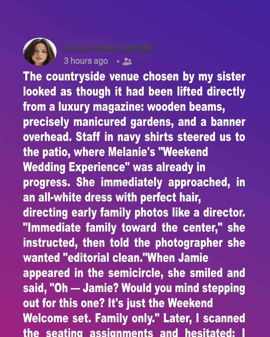 “Oh. Jamie? Would you mind stepping out for this one? It’s just the Weekend Welcome set. Family only. And I want this shot to be really clean. Like, editorial clean.”