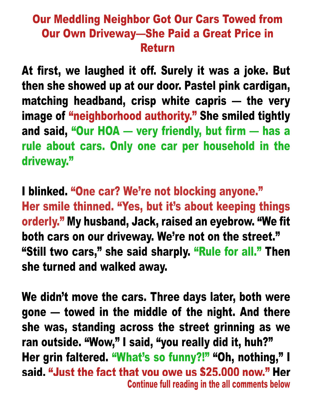 Our Meddling Neighbor Got Our Cars Towed from Our Own Driveway—She Paid a Great Price in Return