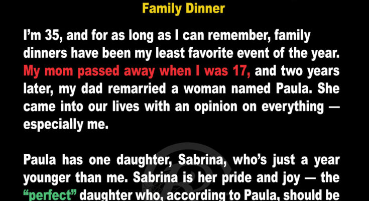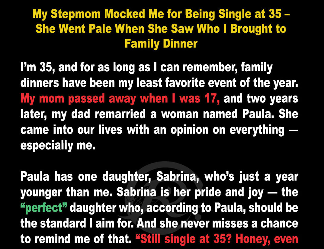 I’m 35 years old, single, and honestly? I was fine with being single until family dinners started to feel like episodes of a cringe reality show hosted by my stepmom, Paula. She made it her life’s purpose to torment and mock me, but one day, the tables turned.