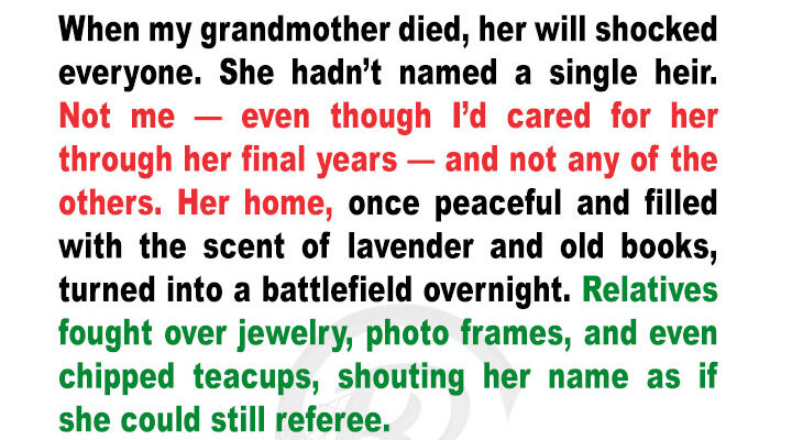 “Don’t lie to me!” my mother yelled. “You lived with her for the last six months. She must have left everything to you! You were always her favourite granddaughter,” she said, overplaying that last line.