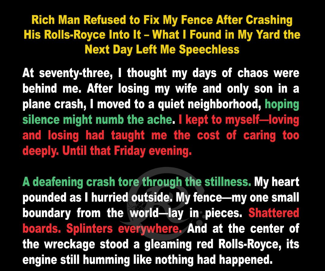 My fence, a structure older than most of the homes on this street, lay in shambles! Splintered planks were strewn across the lawn, some jammed into the bushes. And lodged squarely into the wreckage was a gleaming red Rolls-Royce, its rear end still partly inside my yard.