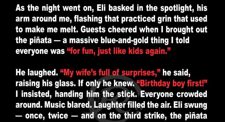 Eli froze mid-swing, the stick still hanging in his hand. His face drained of color, his smile collapsing in on itself. The room’s golden boy, the charming husband, and the life of every gathering stood exposed, his secrets scattered like bones at his feet.