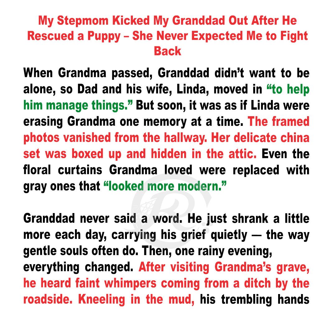 When I found my 86-year-old granddad sitting on his own porch with a suitcase and trash bags, clutching a wounded puppy to his chest, I knew my stepmom had finally crossed a line. What she didn’t know was that I’d been waiting two years for this moment, and I was about to do something she wasn’t expecting.