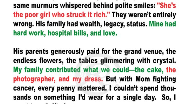 The smiles on people’s faces didn’t feel warm — they felt strained. I could hear the low murmurs, see the sideways glances at my gown. One woman even leaned toward her husband and whispered behind her hand, not nearly as discreet as she thought.