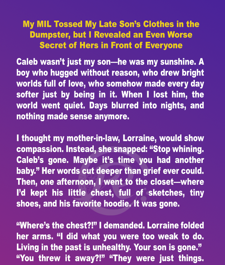 Two years after my little boy died, the only pieces of him I had left were preserved in a cedar chest I held dear. When my mother-in-law tossed it in the dumpster and called his things “garbage,” I swore I’d make her regret it. And I did… right in front of the whole family.