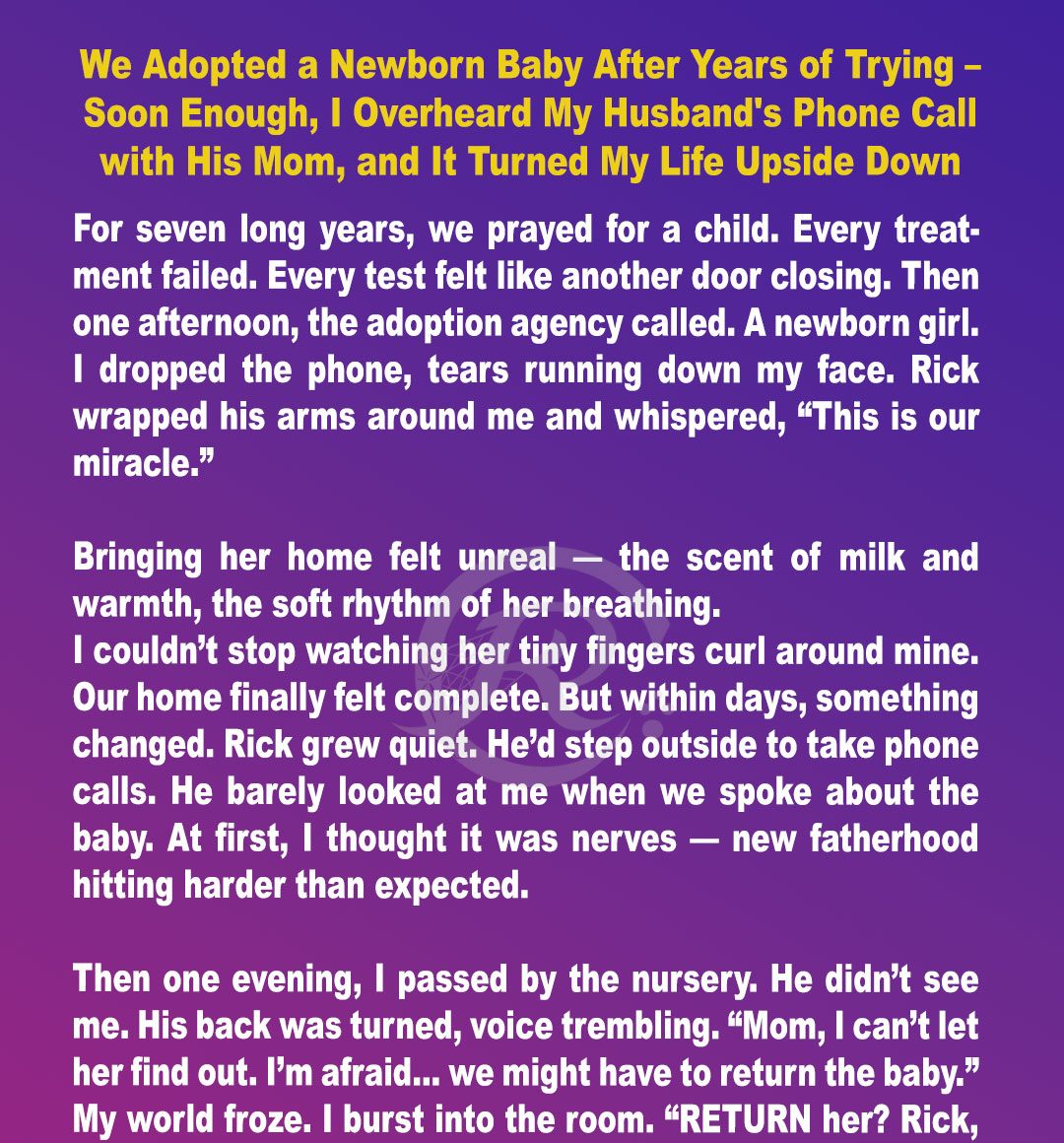 “Listen,” he said. “I can’t let Shelby find out. I’m afraid… I think we might have to return the baby. We can say it’s not working out. That we’re struggling to bond. Just… something.”
