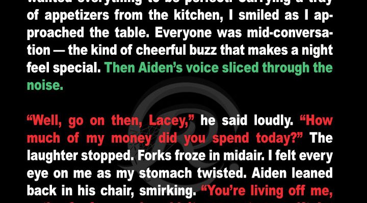 I adjusted a garnish, took a breath, and balanced the platter in my hands. As I stepped into the living room, warmth still clinging to my smile, Aidan’s voice cut through the air like a blade.