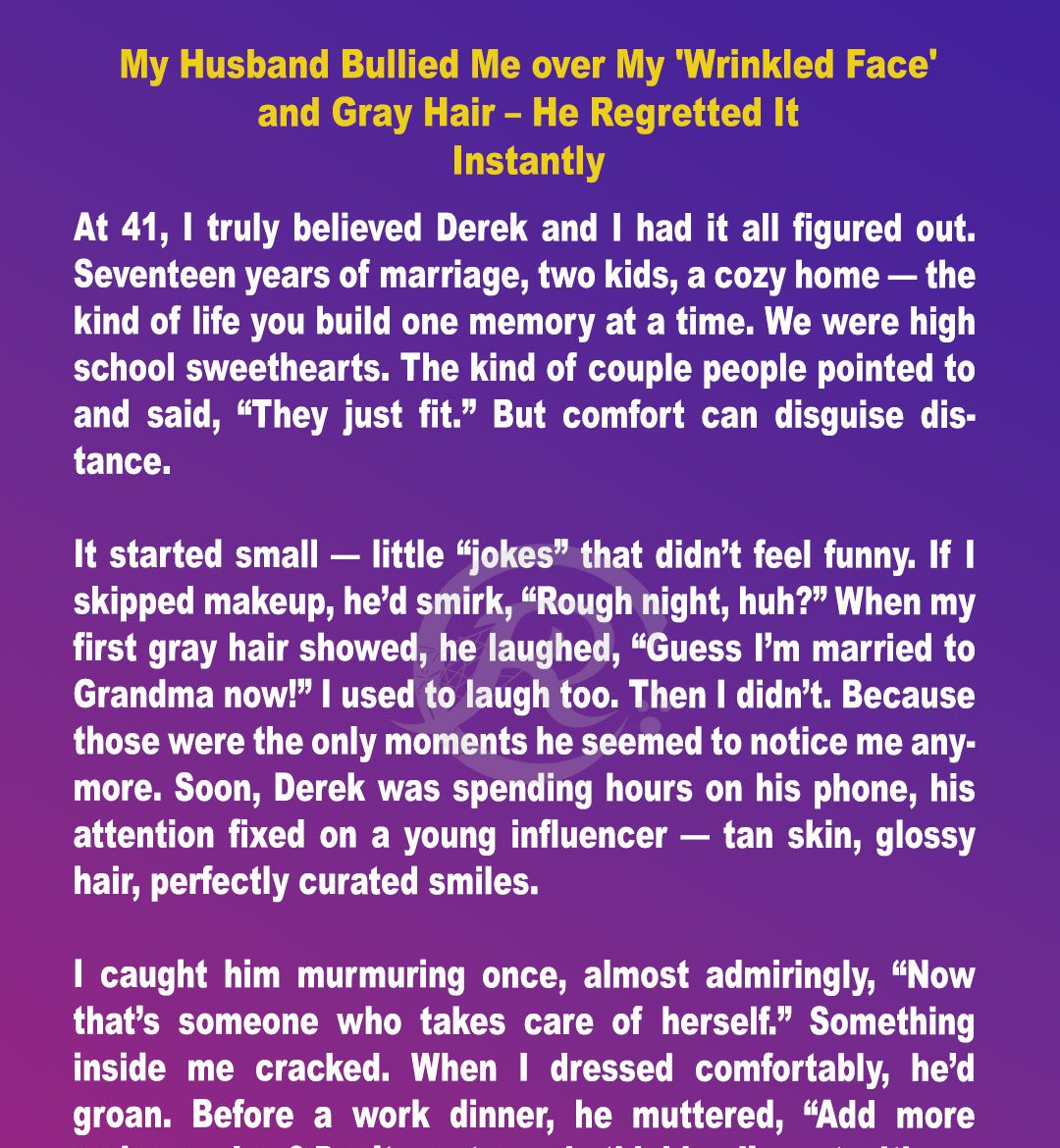 For years, Derek had mocked me for every little wrinkle, every gray hair, and every single sign that I was aging like a normal human being.