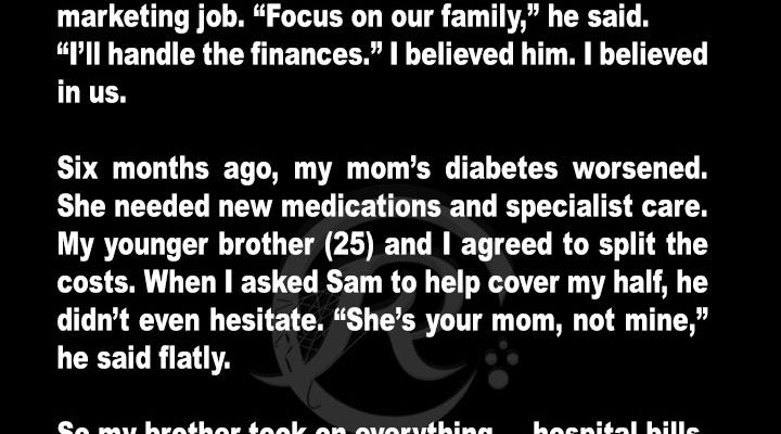 “Sam,” I began, keeping my tone calm. “Mom’s treatments are getting expensive. The insurance only covers part of it, and the new medication isn’t cheap. I was wondering if we could help cover just half of the cost?”