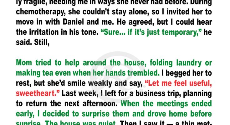 When I left town for work, I trusted my husband to care for my mother, who was battling cancer. But when I came home early and found her sleeping on a thin mattress in the hallway, shivering under a single blanket, I couldn’t believe my eyes. How could he be so cruel?