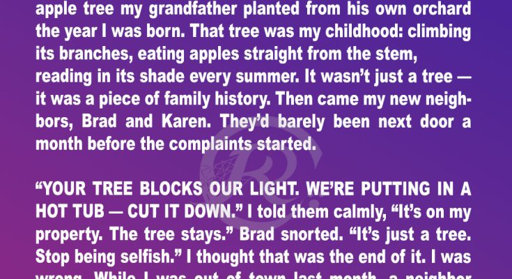 That tree was everything. My grandparents planted it the day they moved in, fifty years ago. The sapling came from my grandfather’s family orchard. It grew alongside our family. I spent countless summers in its branches, falling asleep in its shade, picking apples for pies. It wasn’t just a tree. It was history. It was them.