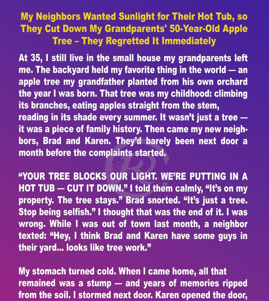 When my grandparents planted that apple tree 50 years ago, they couldn’t have known it would one day spark a legal battle, destroy a neighborly peace, and lead to three towering trees of revenge.