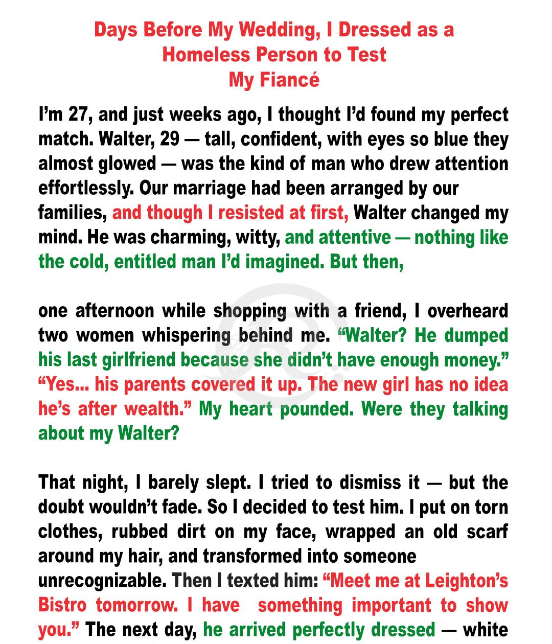 I looked like someone forgotten by the world. I stared at my reflection and barely recognized the person in the mirror. I wasn’t Ava, the bride-to-be — now, I was just another invisible person. And that’s exactly what I needed to be.