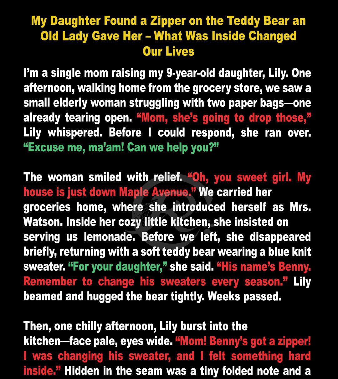 When my nine-year-old daughter found a hidden zipper on the teddy bear an old woman gave her, I thought it was just a quirky surprise. But what we found inside led us down a path we never expected, and nothing was ever the same again.