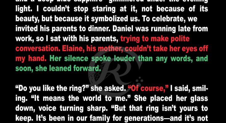 Daniel had just walked in. He stood in the middle of the dining room, his coat still on, his jaw tight. Elaine sat at the table, the ring twirling slowly between her fingers like it was a trophy. Richard was quiet, pretending to sip his wine while looking pained.