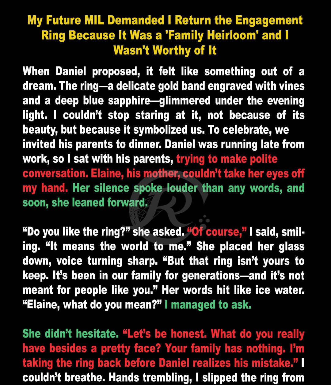 “That ring has been in our family for generations, my girl,” she said, her eyes narrowed. “It’s not just something to wear. That ring represents legacy, history, and our blood.”