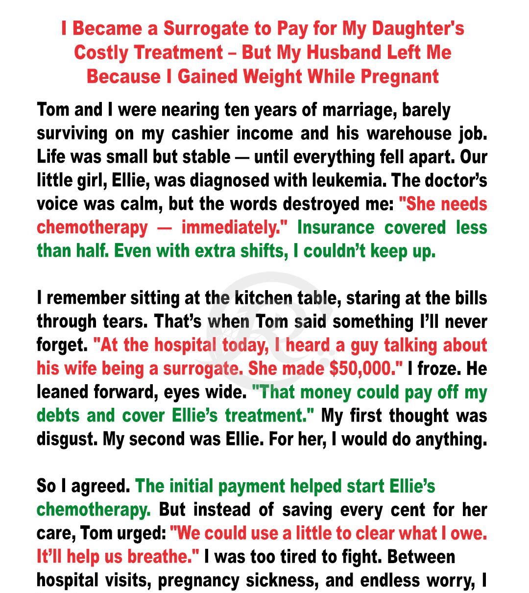 On my days off, I drove my daughter to chemo at the hospital, holding her hand through her nausea, singing to her while she cried. With the first payment of my surrogacy, we started her most intense treatment.