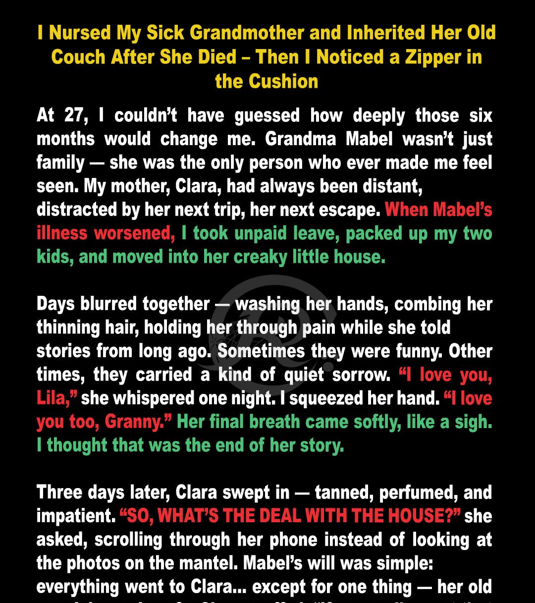 When Lila nurses her dying grandmother through her final days, she doesn’t expect to inherit more than memories. But tucked inside an old couch is a secret that changes everything, revealing the truth about love, legacy, and what it really means to be chosen.