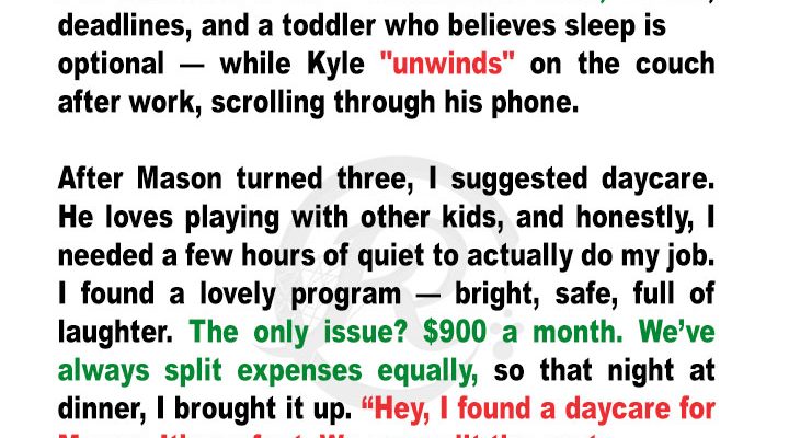 “Kyle, we need to talk about daycare. Mason’s ready. I’ve found a place five minutes away. It’s clean, has great reviews, and they’re structured with activities. It’ll give me a real chance to focus during work hours.”