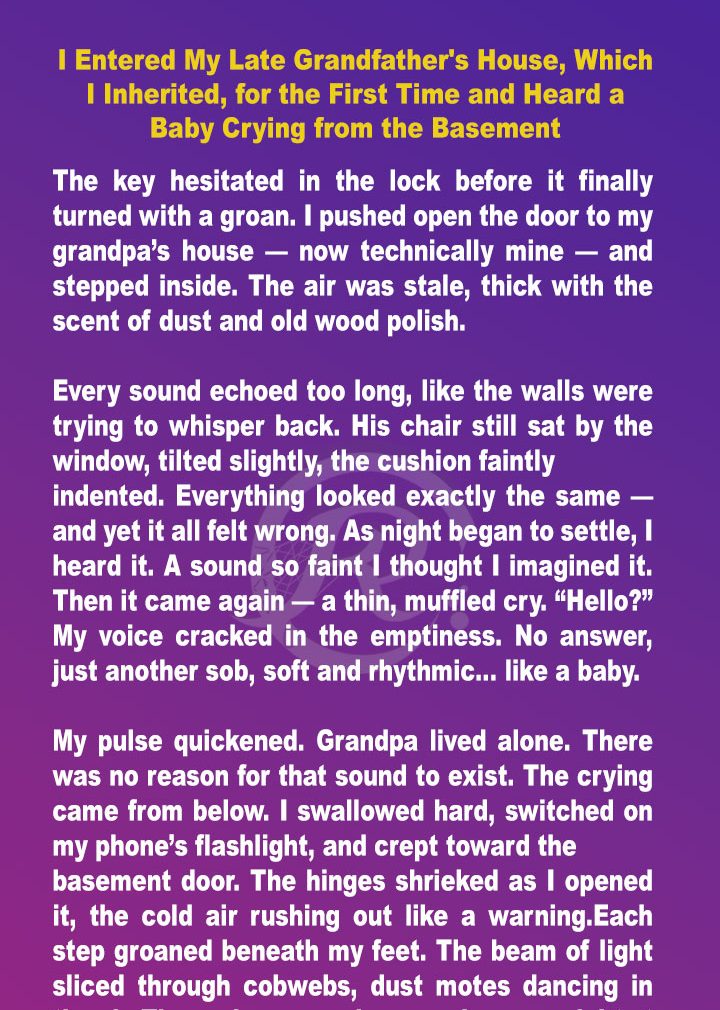 When I stepped into the run-down house my grandfather left me, I was already overwhelmed by grief, and the pressure of my uncertain future. But as I sorted through his belongings, a faint, eerie sound broke the silence — a baby crying in the basement! What I found down there changed everything.
