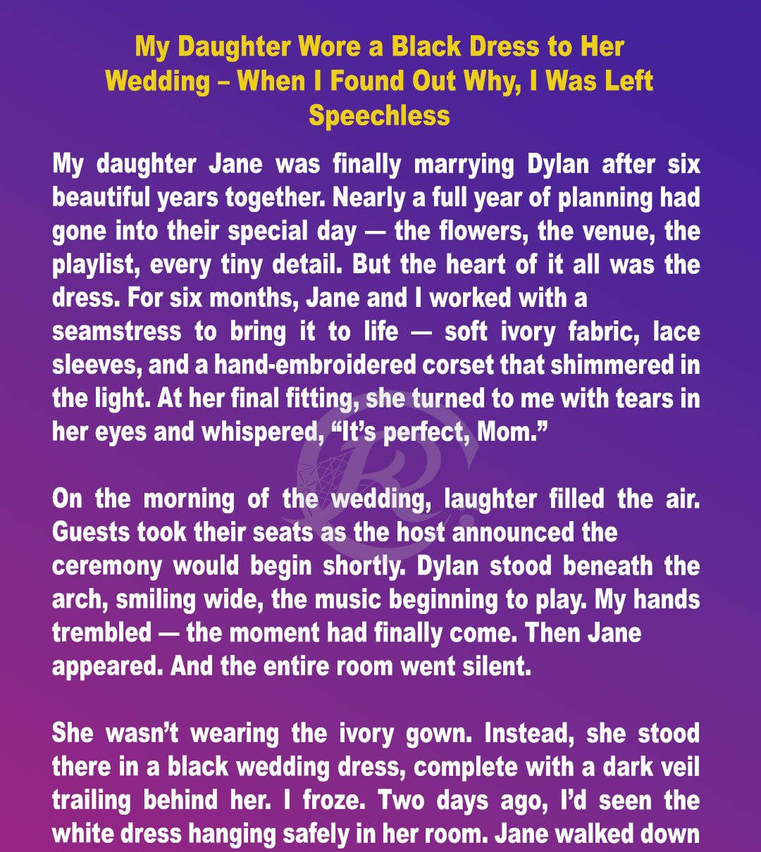 My name is Linda; I’m 55 years old, and last weekend, my daughter, Jane, 33, walked down the aisle in a black wedding dress. But that wasn’t even the biggest surprise of the day; that was just the beginning.