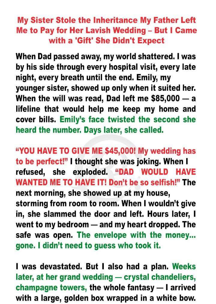 But after the will was read, something in my sister shifted. The wedding was no longer a celebration of love; it became a performance.