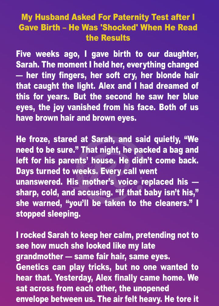 The birth of our first and only child turned into a nightmare when my husband made a shocking accusation about her paternity. I was hurt but determined to prove my innocence but when my husband’s mother got involved, threatening to destroy my life, I discovered something that changed things for good.