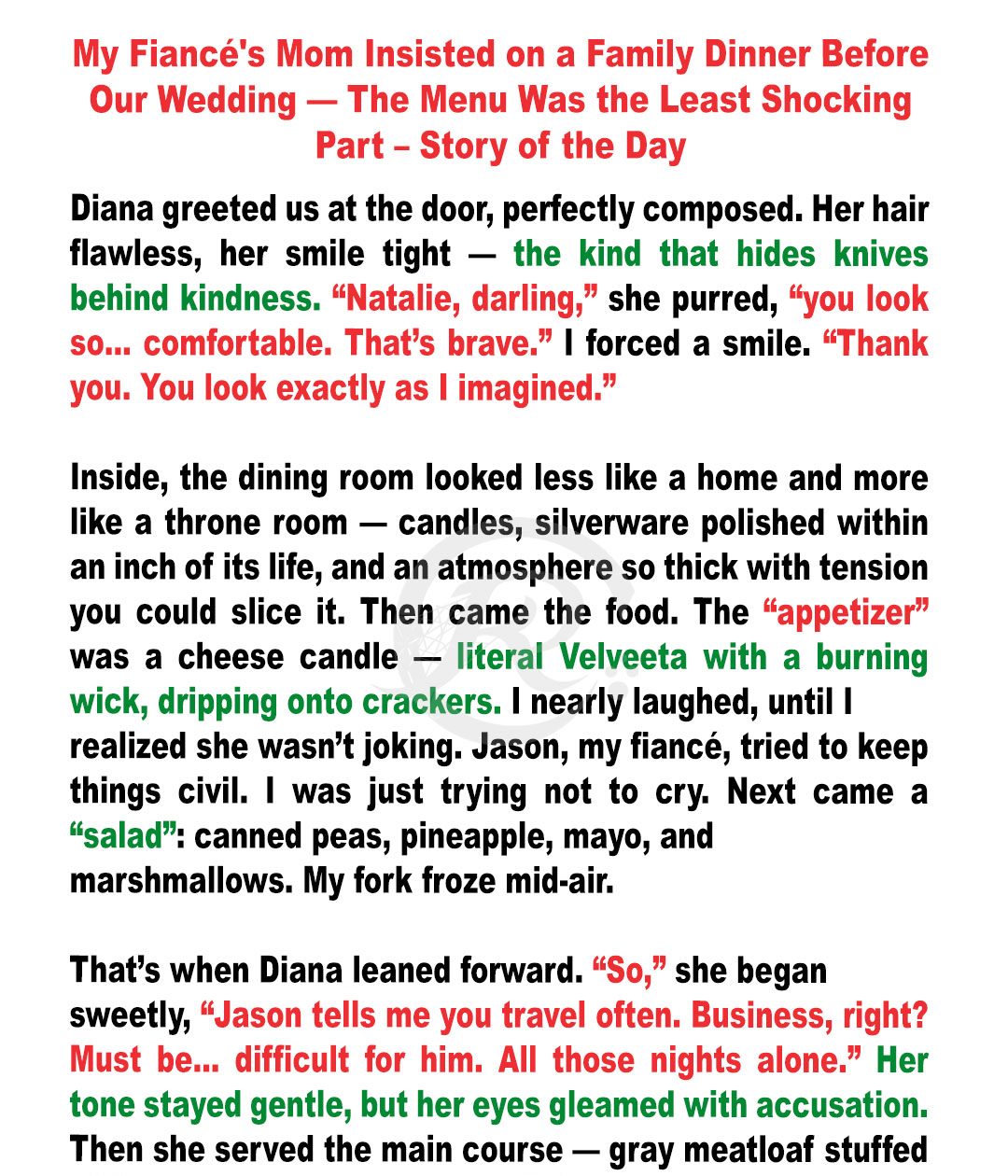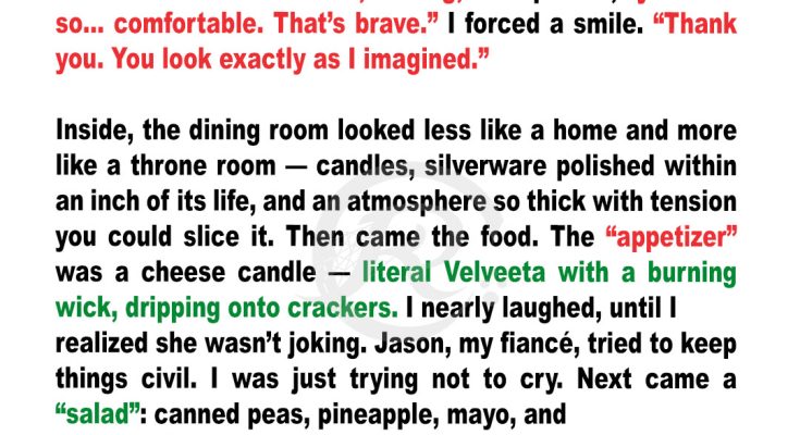 When Jason’s mom lit a cheese candle as the starter during a “traditional” pre-wedding family dinner, I thought the evening couldn’t get any worse. But then she pulled out a manila envelope, and the real reason for the dinner made my stomach drop harder than the Jell-O mold.