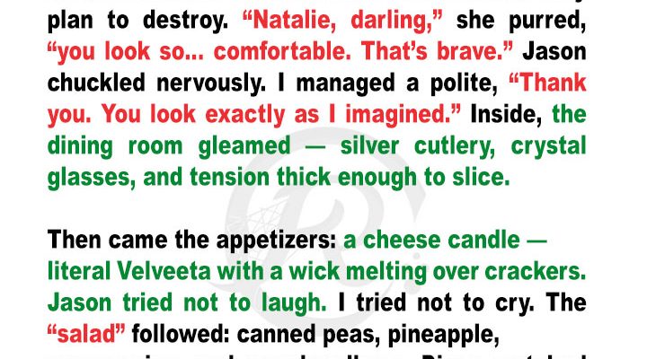 When Jason’s mom lit a cheese candle as the starter during a “traditional” pre-wedding family dinner, I thought the evening couldn’t get any worse. But then she pulled out a manila envelope, and the real reason for the dinner made my stomach drop harder than the Jell-O mold.
