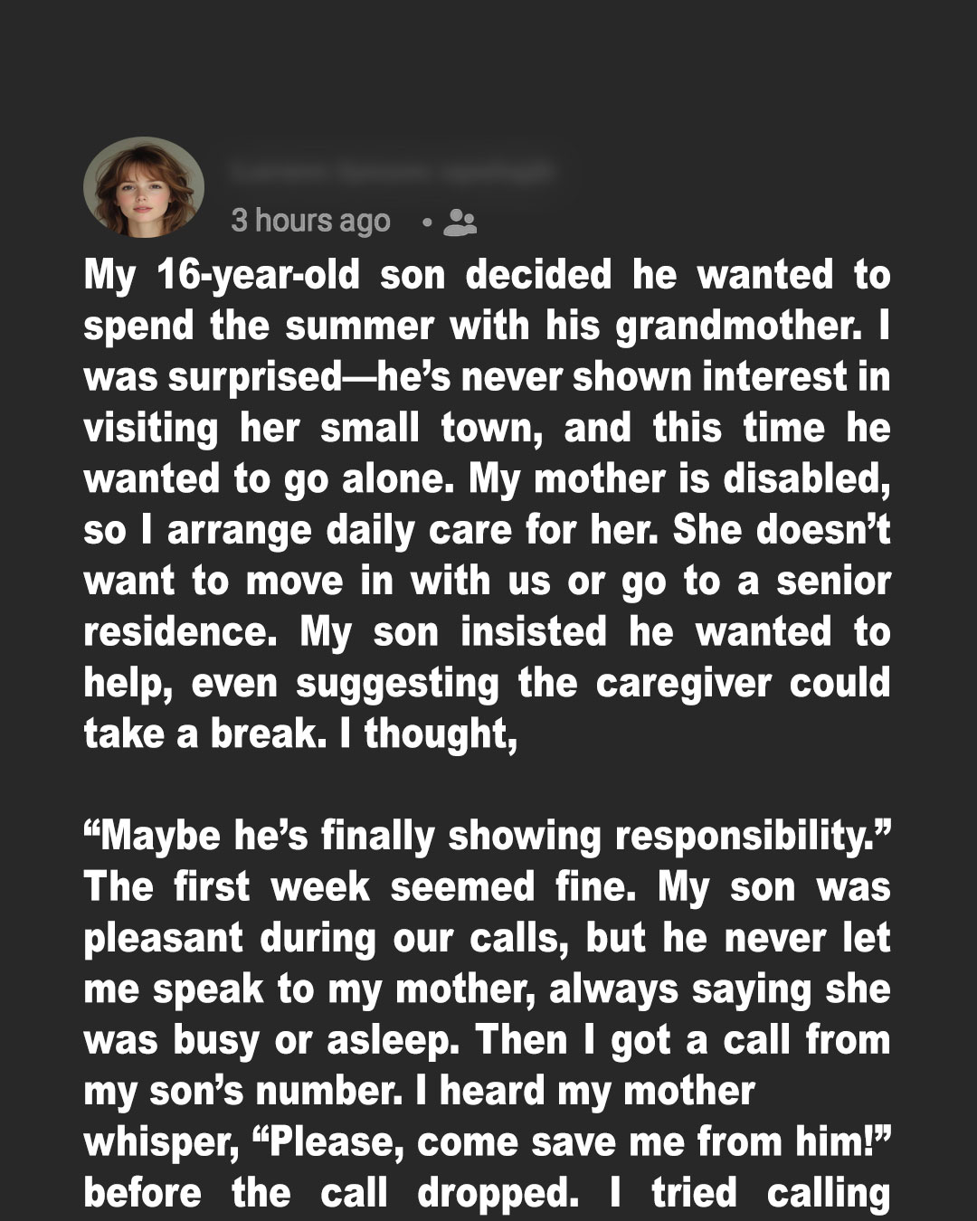 When my 16-year-old son offered to spend the summer taking care of his disabled grandmother, I thought he’d finally turned a corner. But one night, a terrifying call from my mother shattered that hope.
