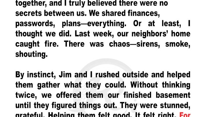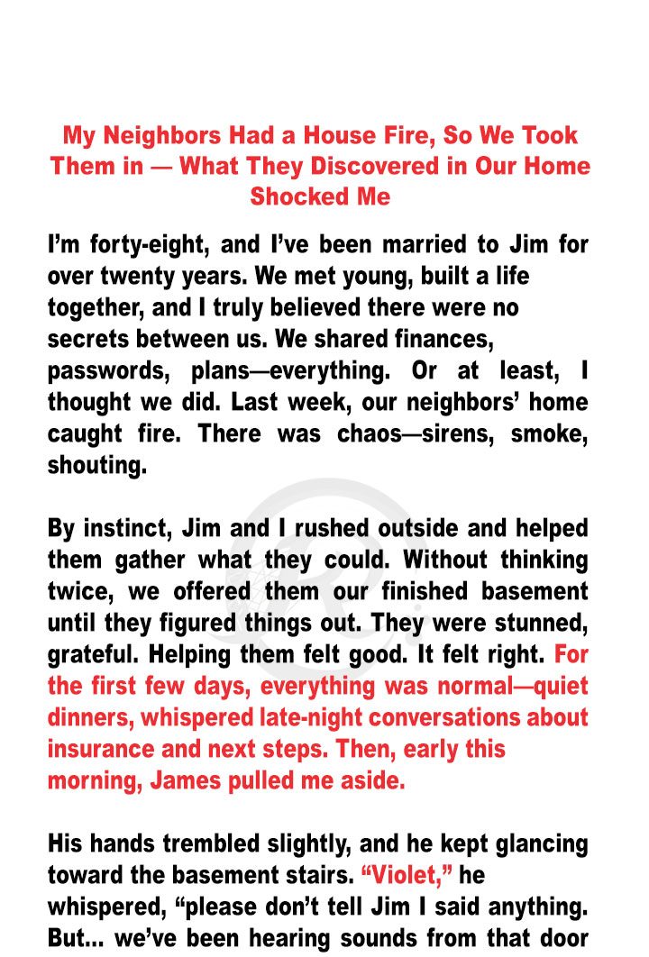 When a fire forced their neighbors to seek refuge in their home, Violet stumbled upon a shocking secret hidden in the basement. The unexpected discovery not only tested her trust in her husband Jim but also challenged the very fabric of their seemingly perfect life.