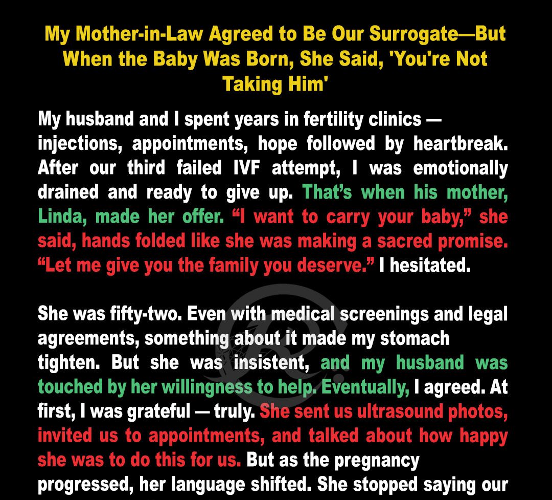 But sometime around the seventh month, her tone changed. One day, I mentioned setting up the nursery, and she chuckled and said, “Don’t rush. He’ll be staying with me a lot, anyway.” I laughed nervously, thinking she was joking.