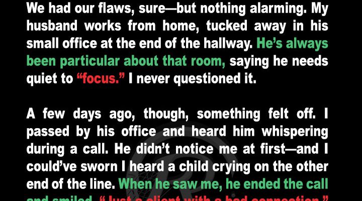 Lately, Jack had been spending more time in his home office. The phone calls went silent the moment I passed by. Once, I even thought I heard crying. I stopped asking questions months ago.