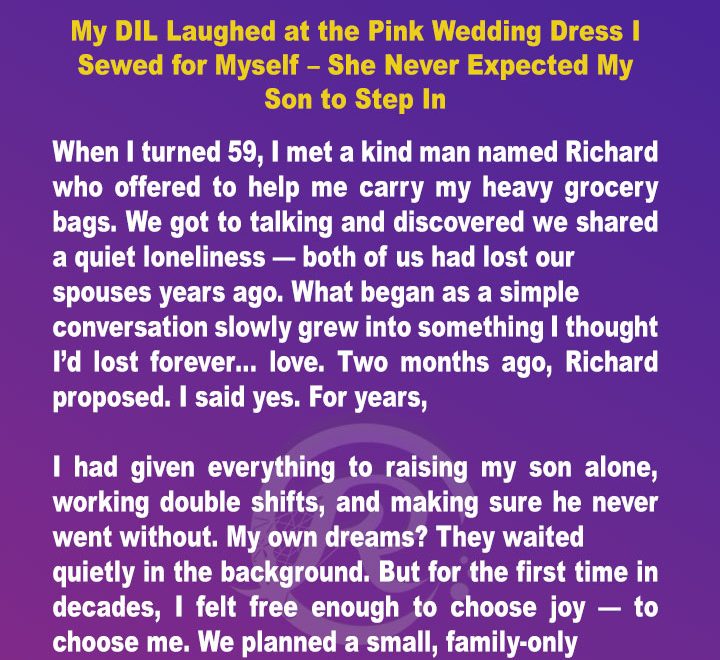 I’m Tina. I’m 60 years old, and I’d just sewn myself a pink wedding dress. After decades of putting everyone else first, I was finally doing something for me. But when my daughter-in-law publicly mocked me at my own wedding, I never expected my son to stand up and say what he did.