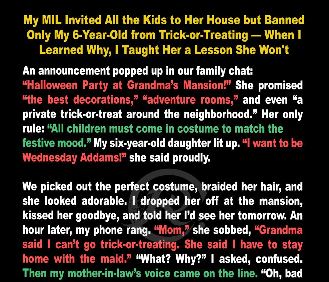 When Natalie’s mother-in-law hosted a Halloween party for all the grandkids, it seemed like harmless fun. But when her six-year-old was cruelly excluded from trick-or-treating, Natalie discovered the shocking truth and gave her mother-in-law a public lesson she’d remember forever.