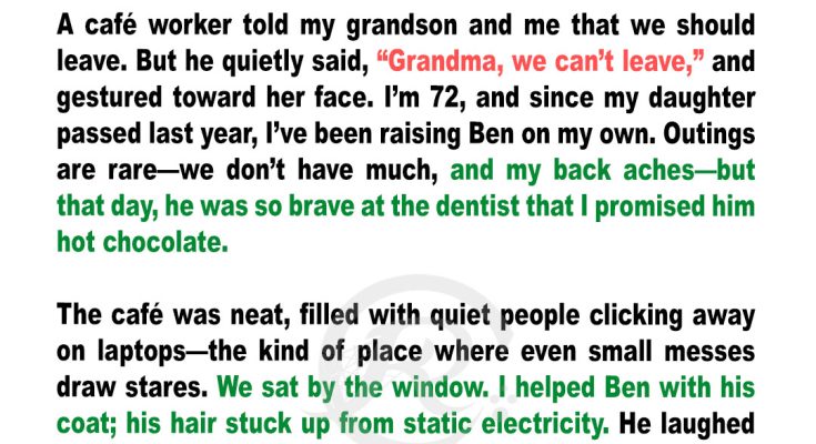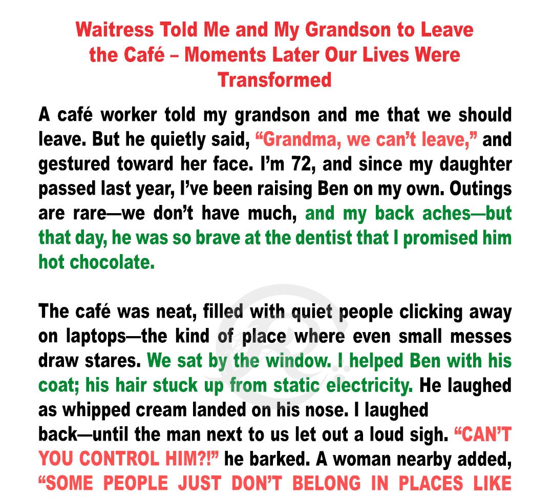 They said we didn’t belong there. One minute, my grandson was giggling over whipped cream. The next, a stranger muttered, and a waitress quietly asked us to leave the café. I thought it was just cruelty until my boy pointed at her face… and everything I knew about our lives changed.