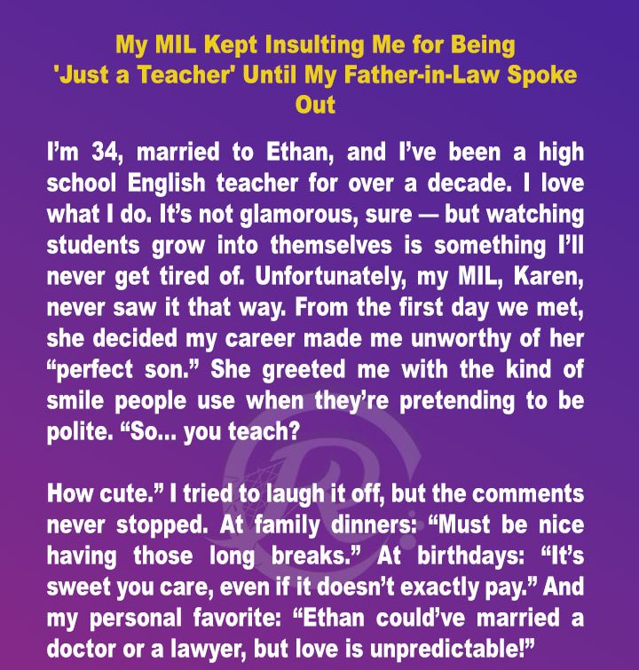 “So, Emily,” she said, tilting her glass toward me, “how’s… the classroom life? Still shaping young minds?”