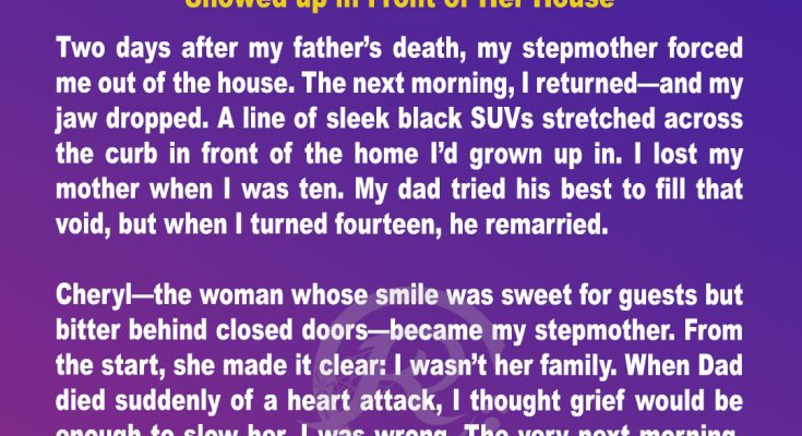 Five black SUVs lined the curb like they were filming a crime movie. Two men in suits stood by the front door. One checked his watch, and the other didn’t move at all. If I didn’t catch him blinking, I would have thought he was a robot.