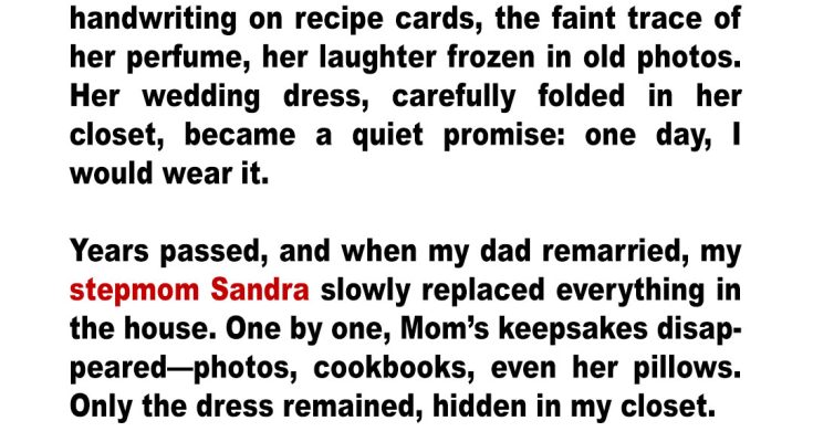 But one thing, one sacred thing, stayed safe: Mom’s wedding dress. I hid it deep in the back of my closet, zipped tight, wrapped like treasure. I checked on it sometimes, just to make sure she hadn’t touched it. And each time, I’d run my fingers across the lace and whisper, “Not this. Never this.”