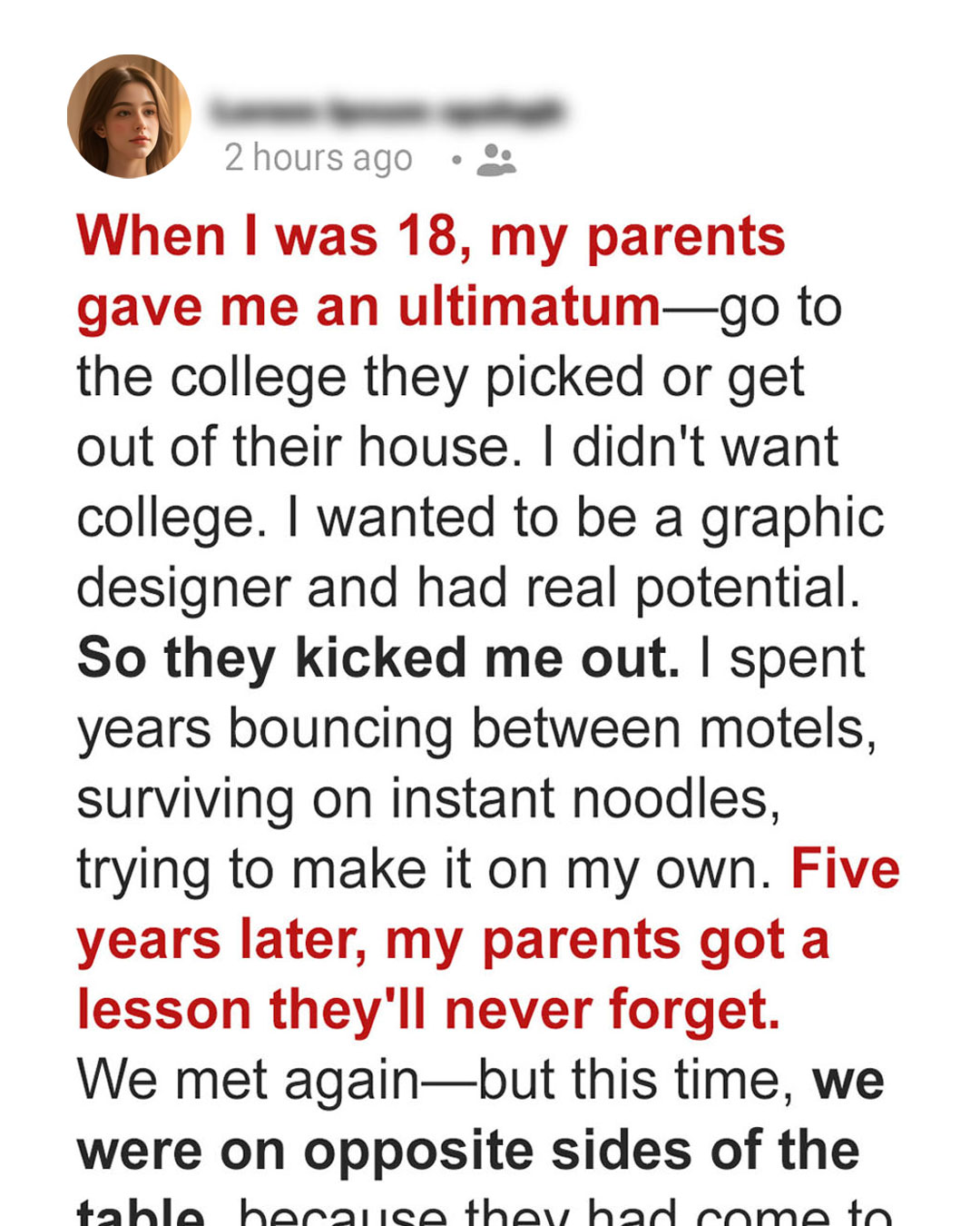 Sometimes the best revenge isn’t planned. Sometimes it’s just living well enough that when the people who hurt you finally see what they lost, the lesson teaches itself. That’s exactly what happened five years after my parents slammed the door in my face for choosing art over their approved college path.