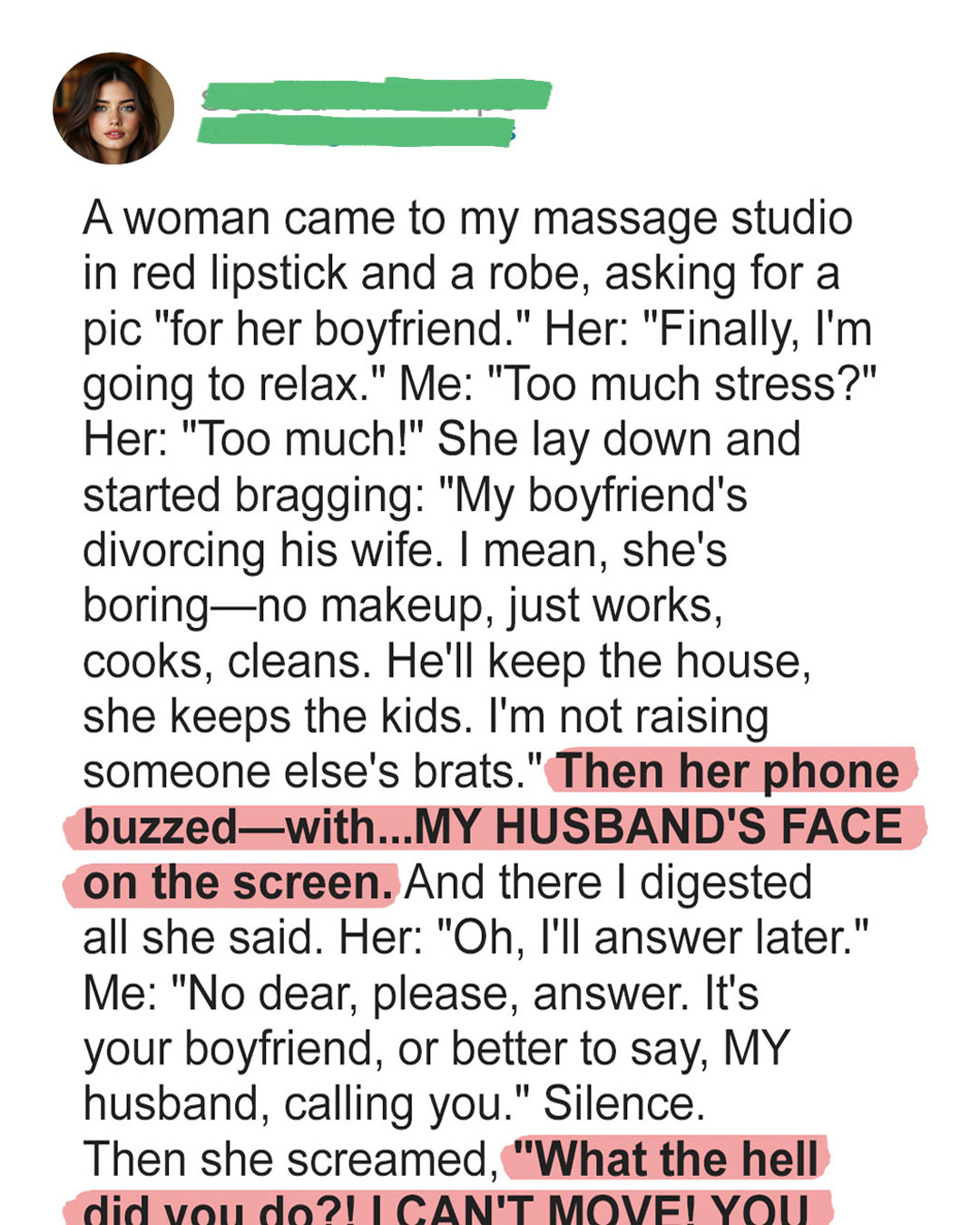 You never think it’ll happen to you. I thought my husband and I had built a life that no one could touch. But then a young, beautiful woman walked into my massage studio and started talking about her life. What she said left me speechless, but my response left her paralyzed.