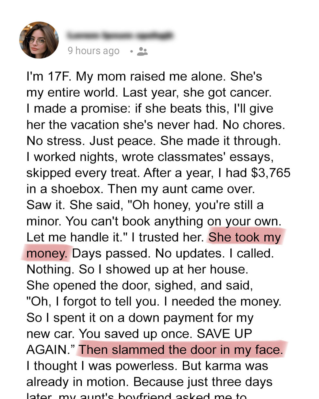 “Recently, I learned something about the woman I’ve been dating that changed everything for me. She stole nearly $4,000 from her 17-year-old niece… money that was meant to take her cancer-survivor mother on a once-in-a-lifetime vacation.”