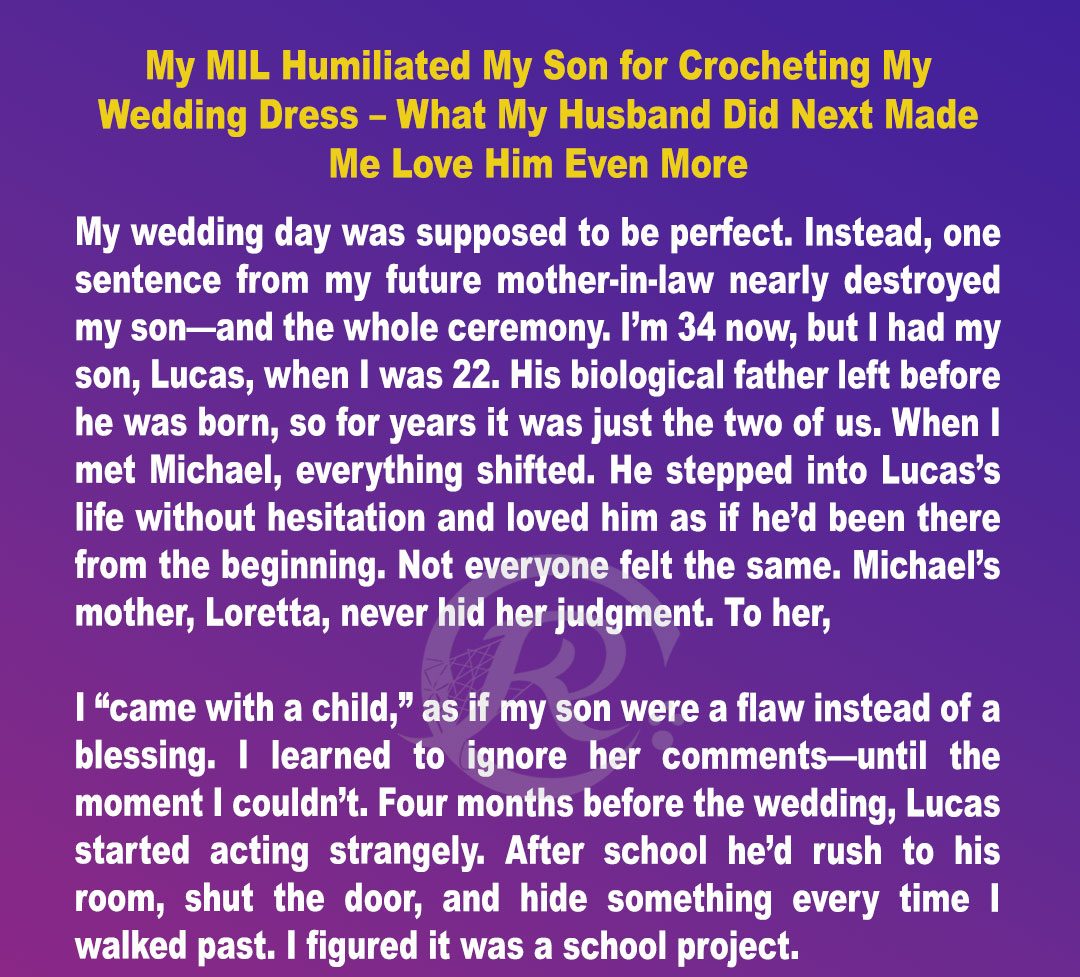 When my 12-year-old son crocheted my wedding dress, I thought it was the most beautiful gift imaginable. But when my mother-in-law publicly mocked him, calling it a “tablecloth” and humiliating my boy to tears, my husband did something that made me fall in love with him all over again.