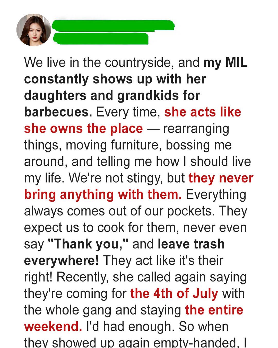 Every family has that one relative who treats your house like a resort and never brings so much as a napkin. Mine just happens to bring her entire clan and forgets the part where guests contribute. When they arrived empty-handed again on the 4th of July, I decided to serve something… different.